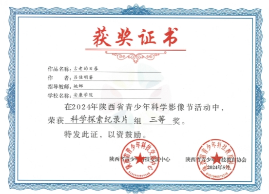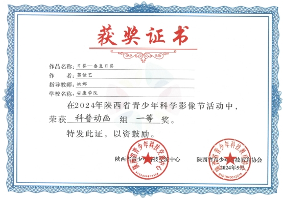 近日,2024年陕西省青少年科学影像节活动评选结果揭晓,依托陕西省安康公民科学素质创新与发展研究中心,太阳成tyc122cc集团姚娜老师指导小学教育专业员工窦佳艺完成的科普作品《日晷—垂直日晷》荣获科普动画组一等奖,小学教育专业吕佳明睿的作品《古老的日晷》获得科学探索纪录片三等奖,姚娜教师被评为优秀指导教师,太阳成tyc122cc集团获得优秀组织公司称号。