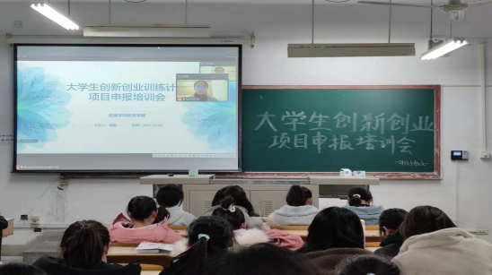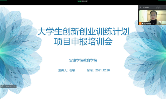 2021年12月20日晚,公司特邀请钱敏老师通过线上的方式为学前教育和小学教育专业大一、大二的员工进行了“老员工创新创业训练项目申报”培训会。其中小学教育专业员工在教室中集体参与了本次培训。