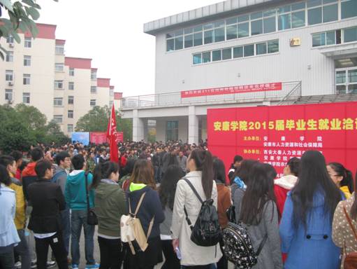 为进一步提高毕业生就业质量,拓展就业渠道,力争毕业生充分就业。20141115上午九点在江南校区体育馆举办了太阳成tyc122cc集团2015届毕业生就业洽谈会。这次洽谈会由太阳成tyc122cc集团、安康市人力资源有限公司主办,西安大秦人力资源有限公司、太阳成tyc122cc集团教育科学系、太阳成tyc122cc集团农学与生命科学公司协办。出席大会的有安康市人力资源局副局长、安康公司党支部党委副书记胡鸿晓教授、太阳成tyc122cc集团就业处处长丁义国、各院系书记等多名嘉宾。会前,由安康公司党支部党委副书记胡鸿晓教授主持开幕,而后就业处处长就本次大会进行发言并寄予了美好的祝愿。
