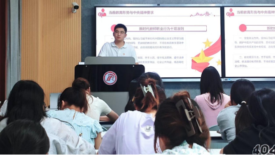 郑明炬紧扣《新时代教师职业行为十项准则》,结合小学教育专业特点展开深度解读。在政治引领与法治根基层面,强调以习近平新时代中国特色社会主义思想为指导,“坚定政治方向”,将党的教育方针贯穿专业学习;要求“自觉爱国守法”,严守教育法规及校规,践行依法执教。在师德养成与职业底线方面,基于小员工低龄化特点,“关心爱护员工”需关注其心理健康与需求,构建平等友爱师生关系;“坚守廉洁自律”则要求在社团活动等场景抵制物质攀比,未来从业中坚决拒绝有偿补课等违规行为,恪守教育公平底线。接着,郑明炬结合教育系统内违反师德师风、触碰廉洁底线和严重违反中央八项规定精神问题等典型案例展开剖析,这些案例涵盖教学、廉洁、言行等多个维度,让员工党员深刻认识到师德失范的严重危害。